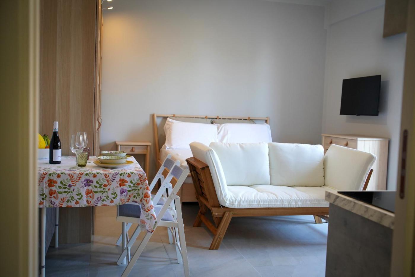 Studio Apartment with Sea View. Boasting a private entrance, this air-conditioned apartment comes with 1 living room, 1 separate bedroom and 1 bathroom with a shower and a bidet. Meals can be prepared in the kitchen, which features a stovetop, a refrigerator, kitchenware and an oven. Featuring a terrace with sea views, this apartment also features a washing machine and a flat-screen TV. The unit has 3 beds.
